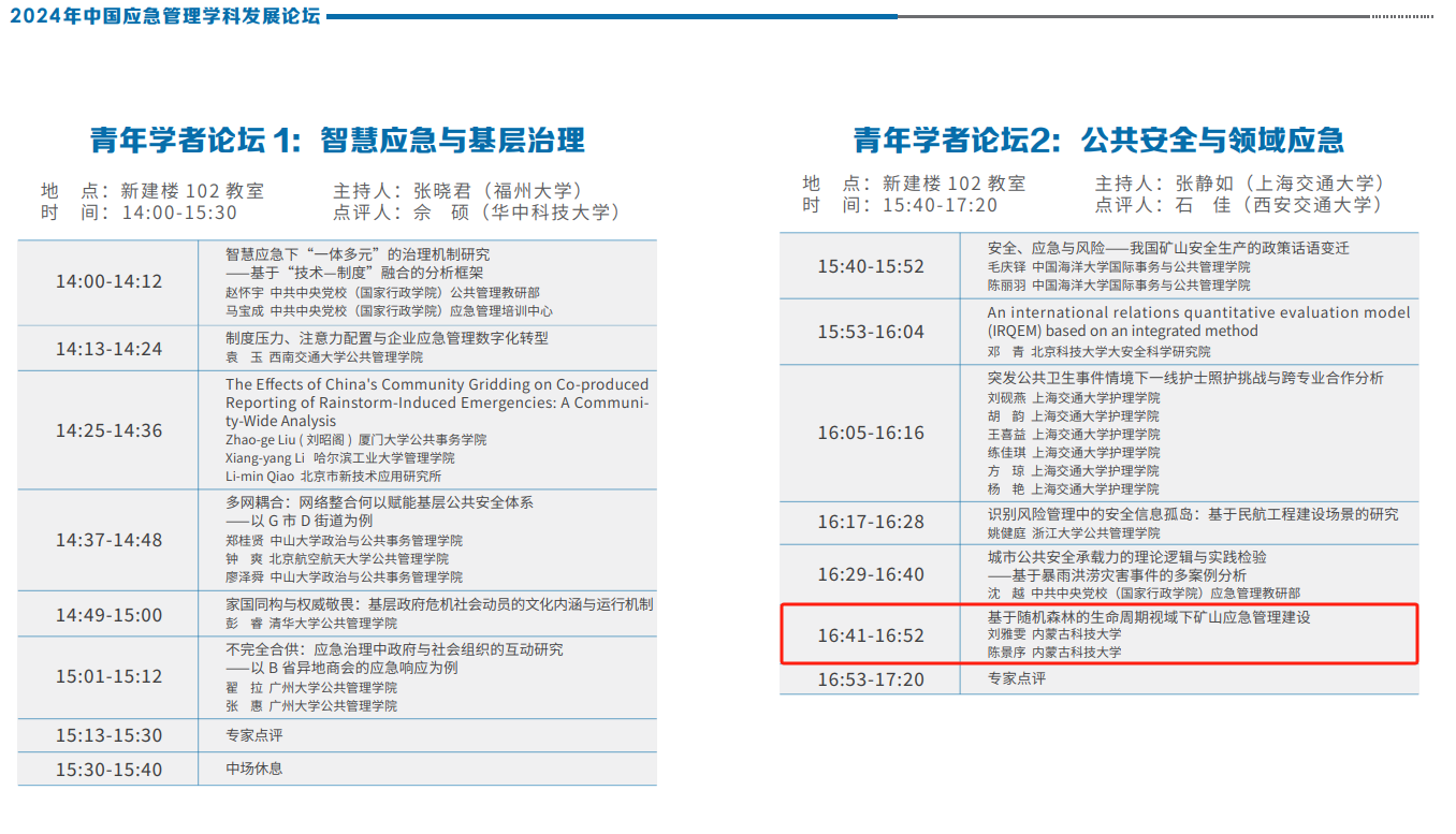 本次会议设立“青年学者论坛”。beat365官网硕士研究生提交了论文《基于随机森林的生命周期视域下矿山应急管理建设》,并在青年学者论坛中以口头报告形式进行了分享与交流。研究立足于矿山应急文化建设,运用随机森林算法技术探究在矿山应急管理建设不同生命周期下应急文化因素所呈现的影响性。