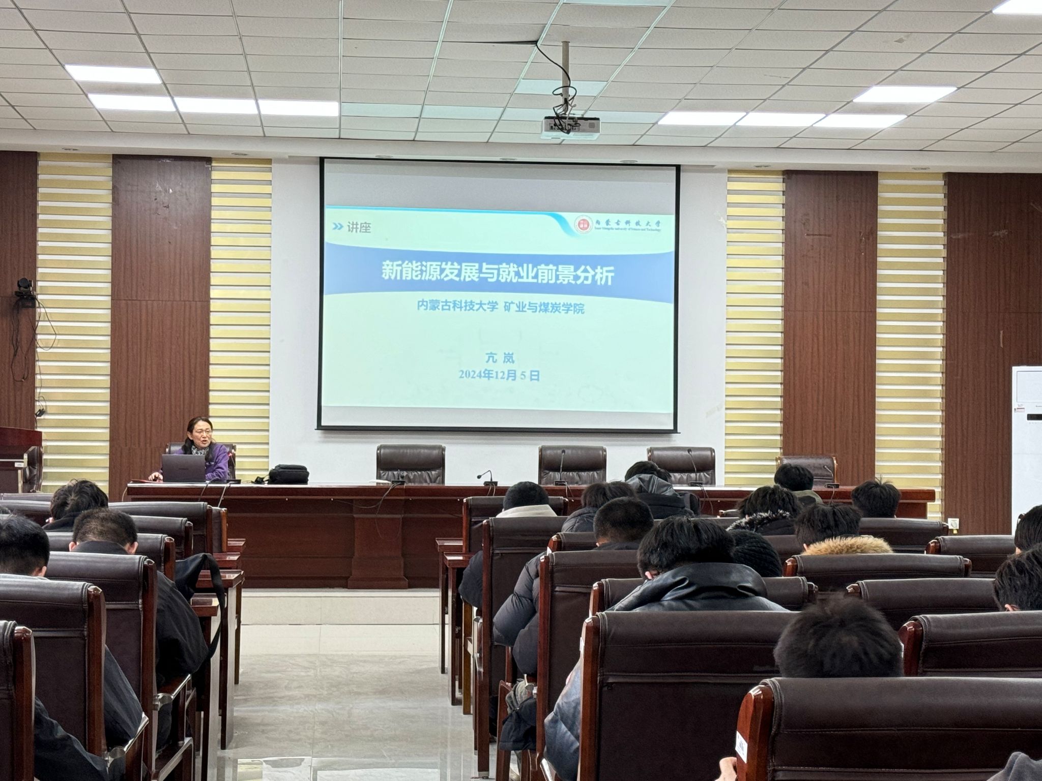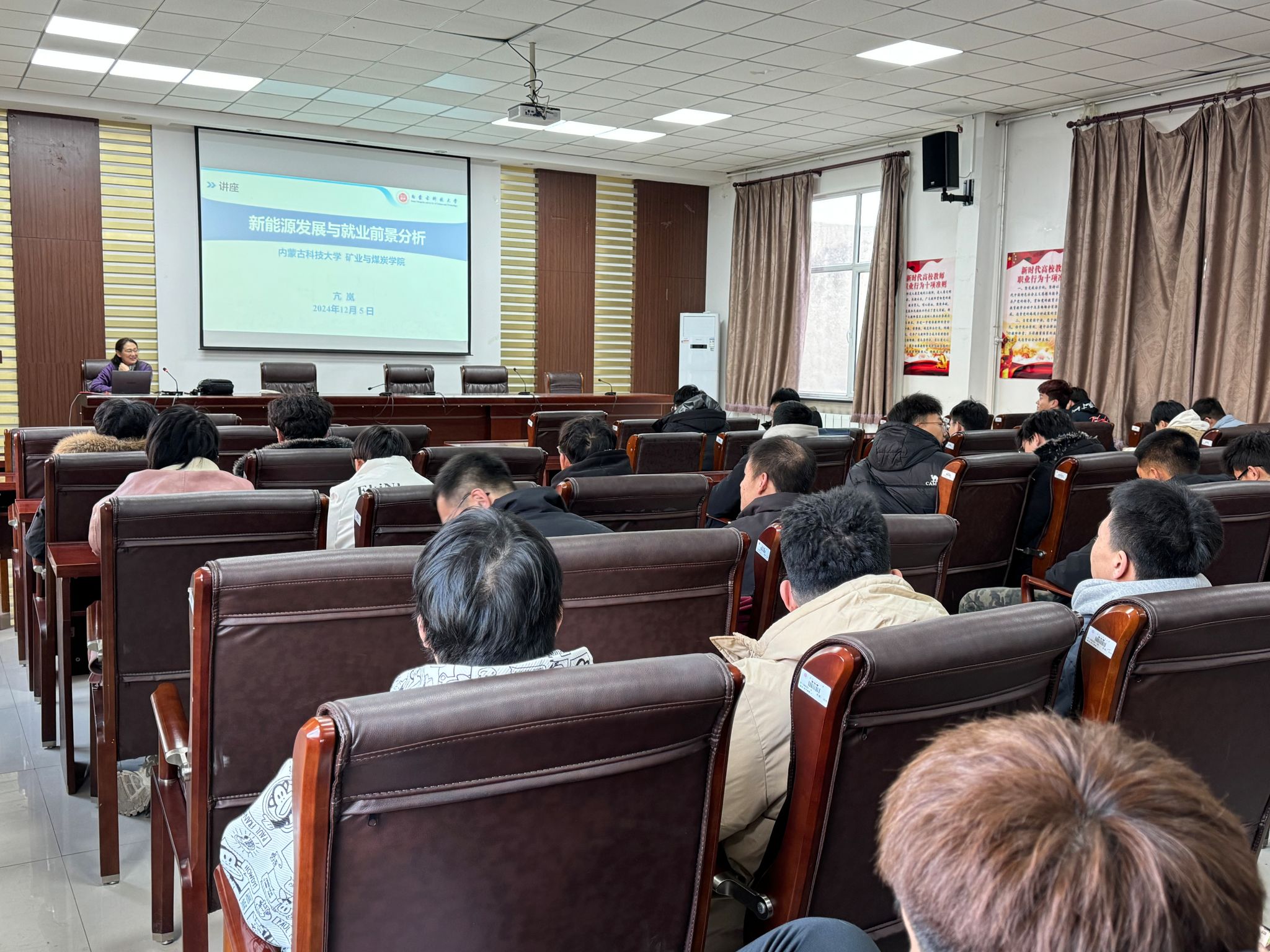 2024 年 12 月 5 日下午 16:00,beat365英国官方网站在实验室训楼二楼会议室举行讲座,机电工程系教授亢岚主讲,矿山机电专业三个年级及电气自动化、机电一体化专业毕业班学生踊跃参与,主题为“新能源发展与就业前景分析”。