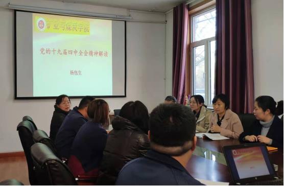 2019年11月14日上午,beat365英国官方网站党副院长兼教授委员会办公室主任杨包生为学院教工第一党支部全体党员在学院办公楼一楼会议室进行“不忘初心、牢记使命”主题教育专题党课。党课以“党的十九届四中全会精神解读”为主题,围绕以下内容展开讲解: