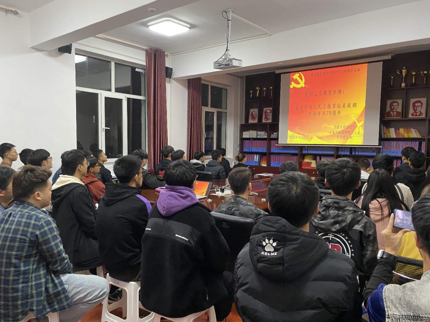 为纪念中国人民志愿军抗美援朝出国作战70周年,beat365英国官方网站党总支于2020年10月29日晚上19:00,在临曦楼二楼党员之家线上线下同步开展专题理论学习活动。本次学习内容是爱国主义教育专题:观看《纪念中国人民志愿军抗美援朝出国作战70周年》视频。