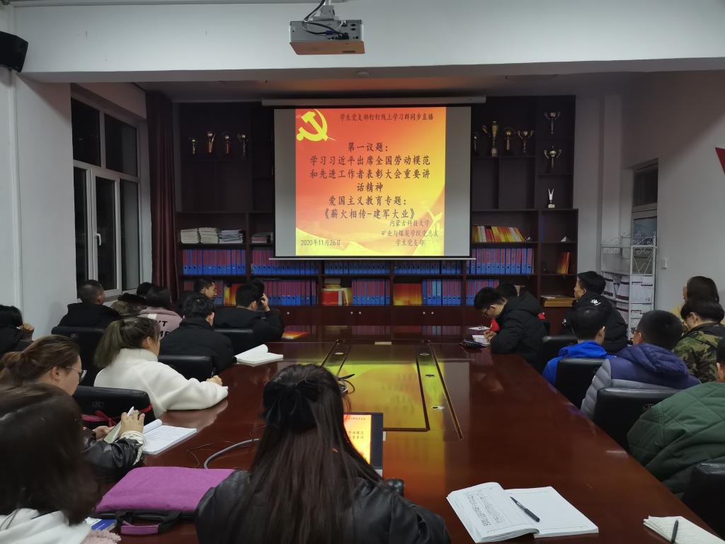 为大力弘扬劳模精神,激励和带动全体学生,beat365英国官方网站党总支于2020年11月26日晚上19:30,在临曦楼二楼党员之家线上线下同步开展专题理论学习活动。本次学习内容是:第一议题:学习习近平出席全国劳动模范和先进工作者表彰大会重要讲话精神;爱国主义教育专题:观看《薪火相传-建军大业》视频。