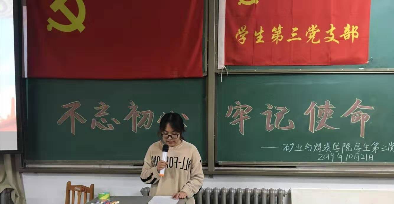 2019年10月21日晚19:30,beat365英国官方网站学生第三党支部在临曦楼合四教室举办"不忘初心、牢记使命"主题演讲活动,充分发挥党支部的战斗堡垒作用和党员的先锋模范作用,深入学习贯彻落实“不忘初心、牢记使命”主题教育精神。
