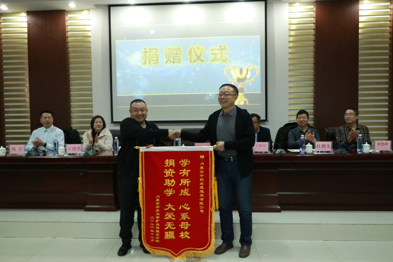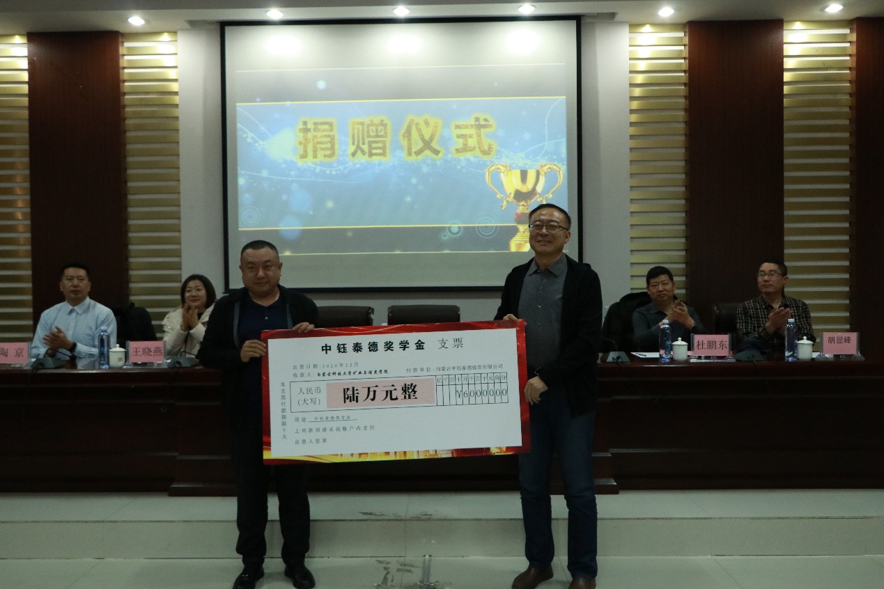 2020年12月9日下午15:00,beat365英国官方网站在实验实训楼会议室举行了“中钰泰德奖学金”捐赠暨颁奖仪式。出席本次会议的领导和老师有:鄂尔多斯市中钰泰德煤炭有限公司副总经理王维利、副总经济师王晓燕、人力资源部经理陶京;beat365英国官方网站学生工作部副部长王树彤、beat365英国官方网站党总支书记王建国、副书记副院长杜鹏东、学生工作办公室主任胡显峰,以及辅导员。