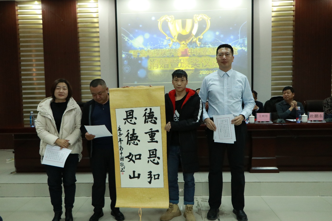 随后,副总经理王维利代表公司向beat365官网捐赠六万元奖学金,王建国书记也代表学院向公司表示谢意并回赠了荣誉证书与锦旗。杜鹏东书记宣读了本次30名获奖学生名单,之后在场嘉宾为获奖学生颁发了获奖证书。接着,获奖学生高中凯同学用书法作品的方式表达了对中钰泰德公司的感谢。获奖学生代表高冬也发表了获奖感言,承诺将会珍惜本次奖励和荣誉,不断努力,认真学习,取得更优异的成绩,创造更美好的未来。