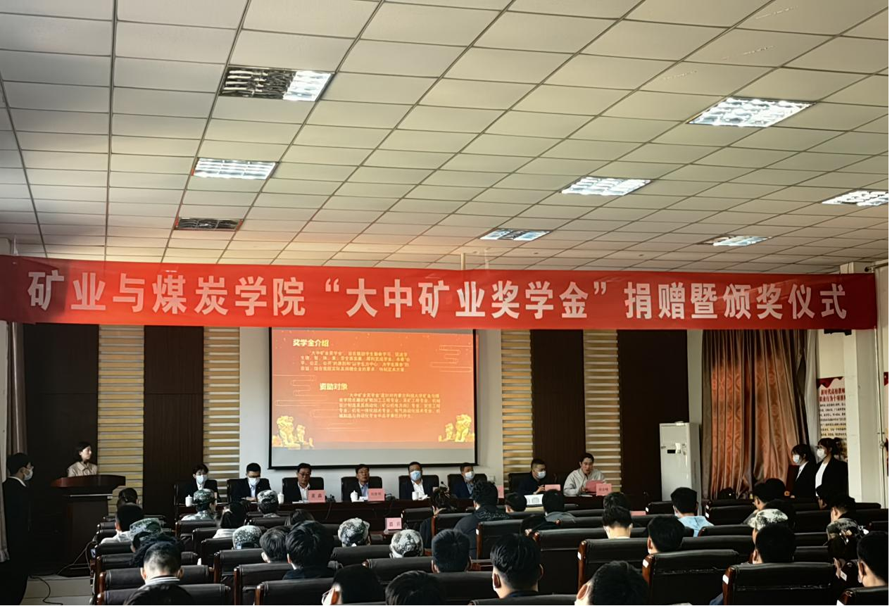 2022年9月23日下午15:00,beat365英国官方网站在实验实训楼会议室举行了“大中矿业奖学金”捐赠暨颁奖仪式。beat365英国官方网站党委副书记、校长任慧平;内蒙古大中矿业股份有限公司党委书记刘鲁明、总经理董鑫、人资培训中心总监王如海、副总监梁艳;beat365英国官方网站党委书记杜鹏东,副书记、副院长孙建平,学生工作办公室主任胡显峰、辅导员以及学生代表参加仪式。仪式由学生工作办公室副主任吴艳丽主持。