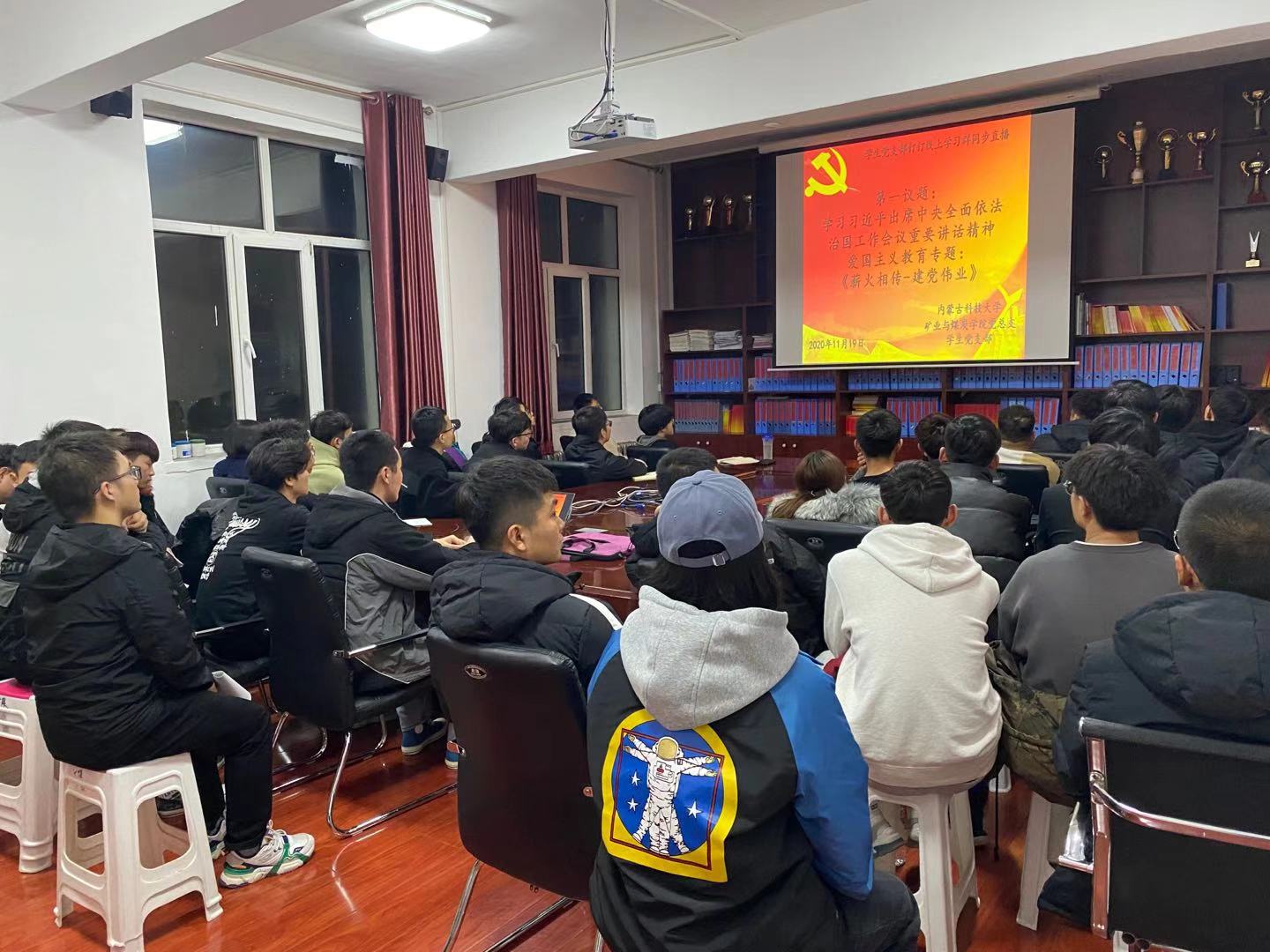为大力弘扬爱国主义精神,beat365英国官方网站党总支于2020年1119日晚上19:30,在临曦楼二楼党员之家线上线下同步开展专题理论学习活动。本次学习内容是:第一议题:学习习近平出席中央全面依法治国工作会议重要讲话精神;爱国主义教育专题:观看《薪火相传-建党伟业》视频。